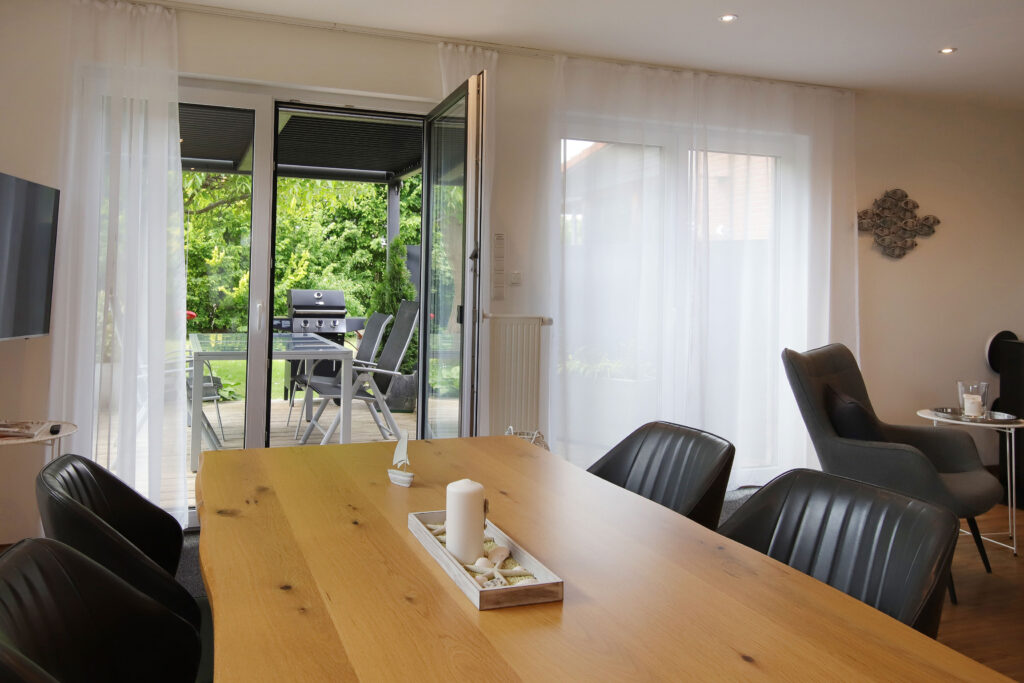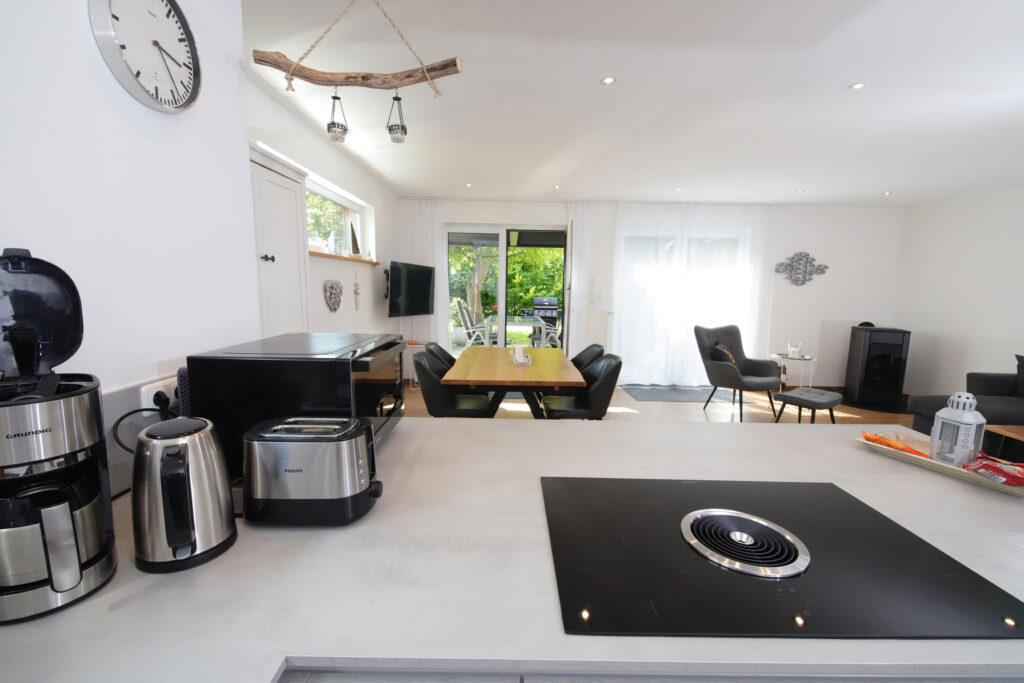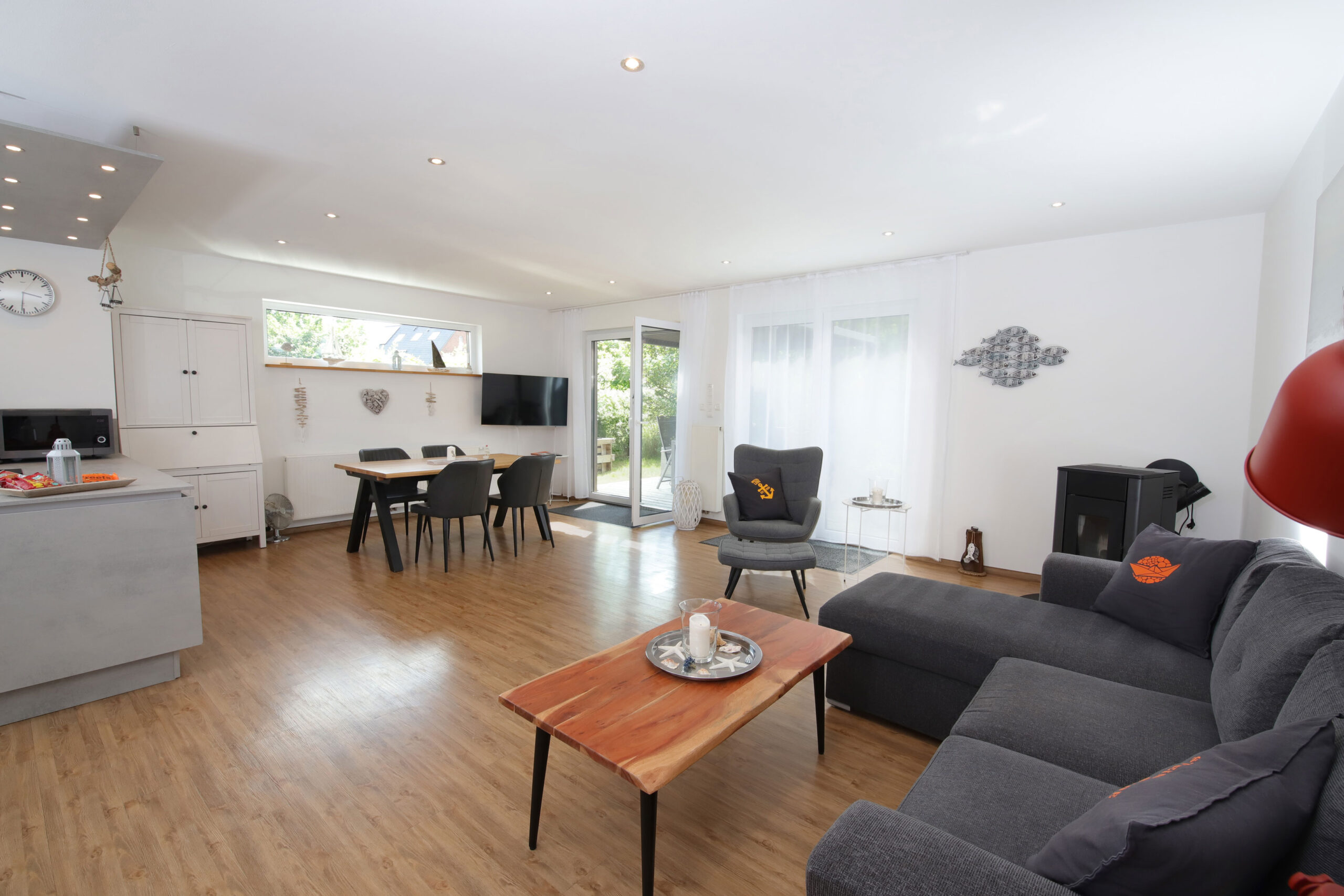 Unsere Ferienwohnung für alle! Liebevoll eingerichtet können Sie sich ganz in den Urlaub hineinentspannen und die Seele baumeln lassen. Die Ferienwohnung wurde im Januar 2023 komplett renoviert, und besitzt einen hellen, großzügigen Wohn- und Essbereich mit einem Pelletofen der abends zum Verweilen einlädt.
